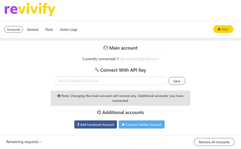 API Key: Here to circumvent the need social network account or revivify account credentials sharing with 3rd parties. Used to connect your ReVivify account with ReVivify WP Plugin on websites. You can acquire an API Key by registering on https://www.revivify.social